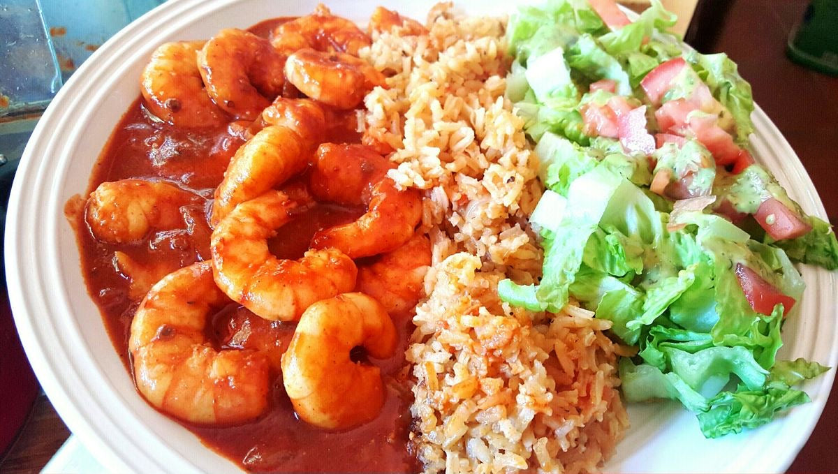 Shrimp cooked with special spicy sauce. Served with tomatoes, lettuce, rice, beans and tortillas.